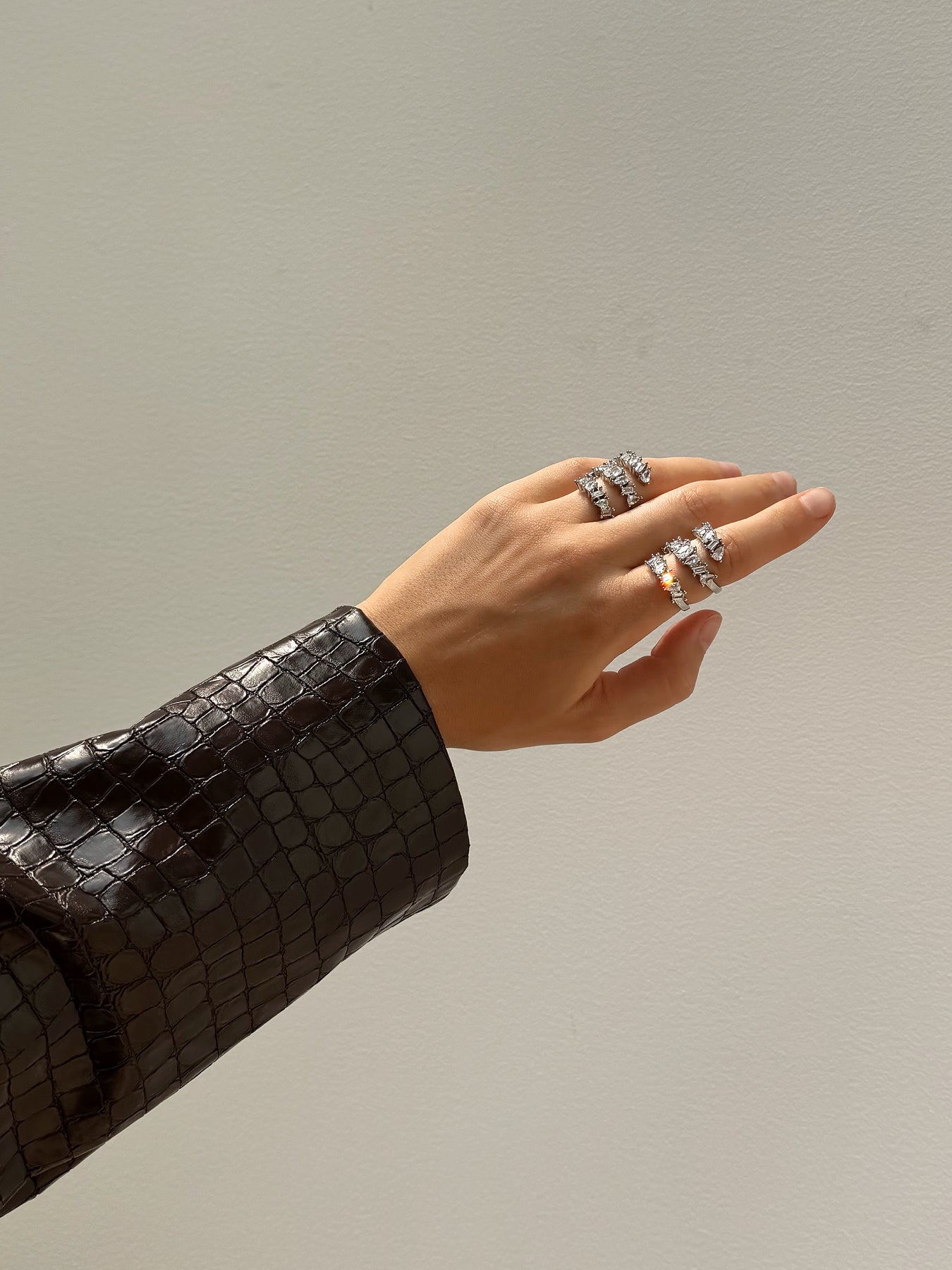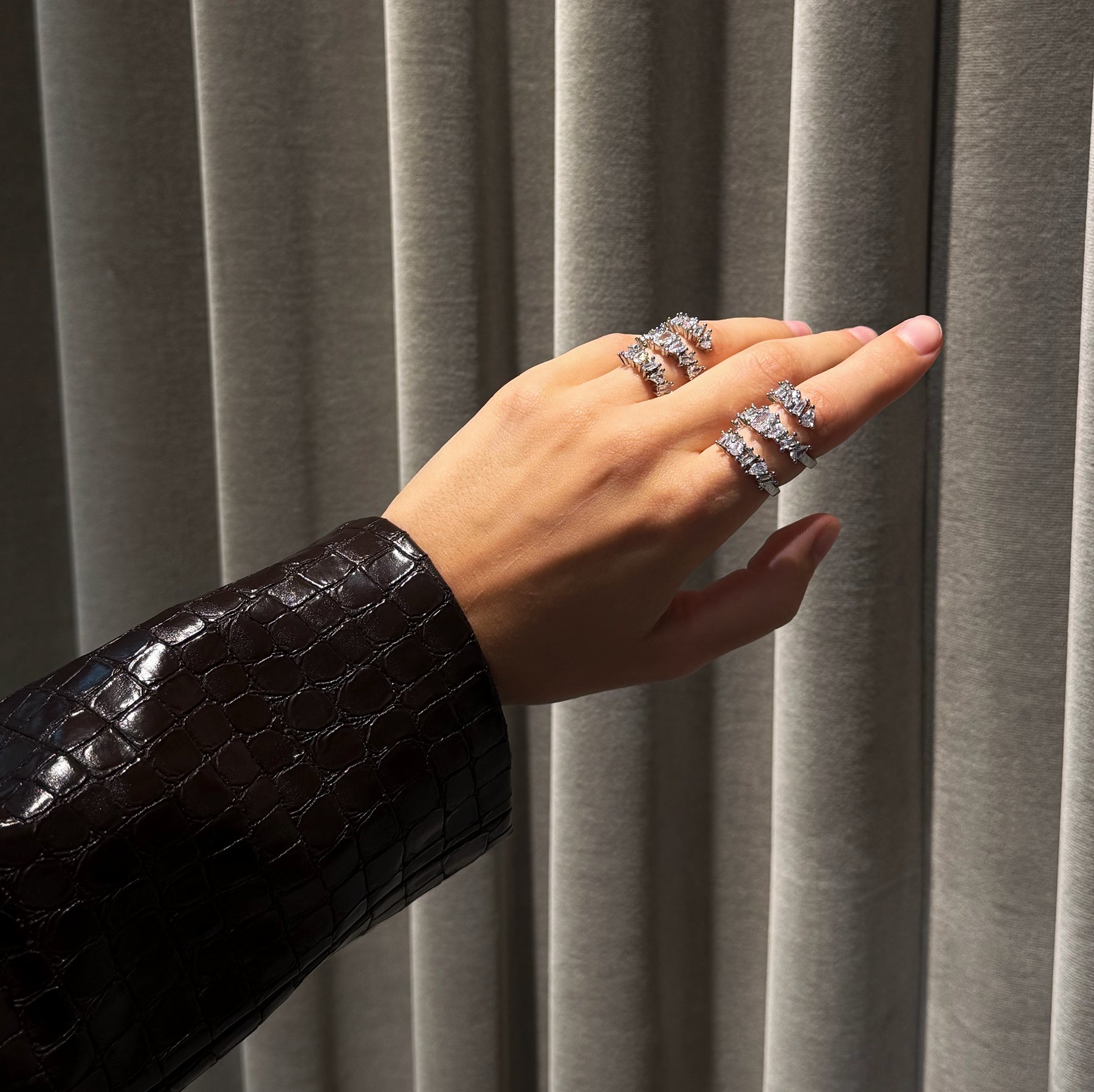This CAMILLA SERETTI ring showcases a layered, multi-band silhouette adorned with shimmering stones that catch the light from every angle. The structured design creates a bold, sculptural effect while maintaining a sleek, wearable feel.