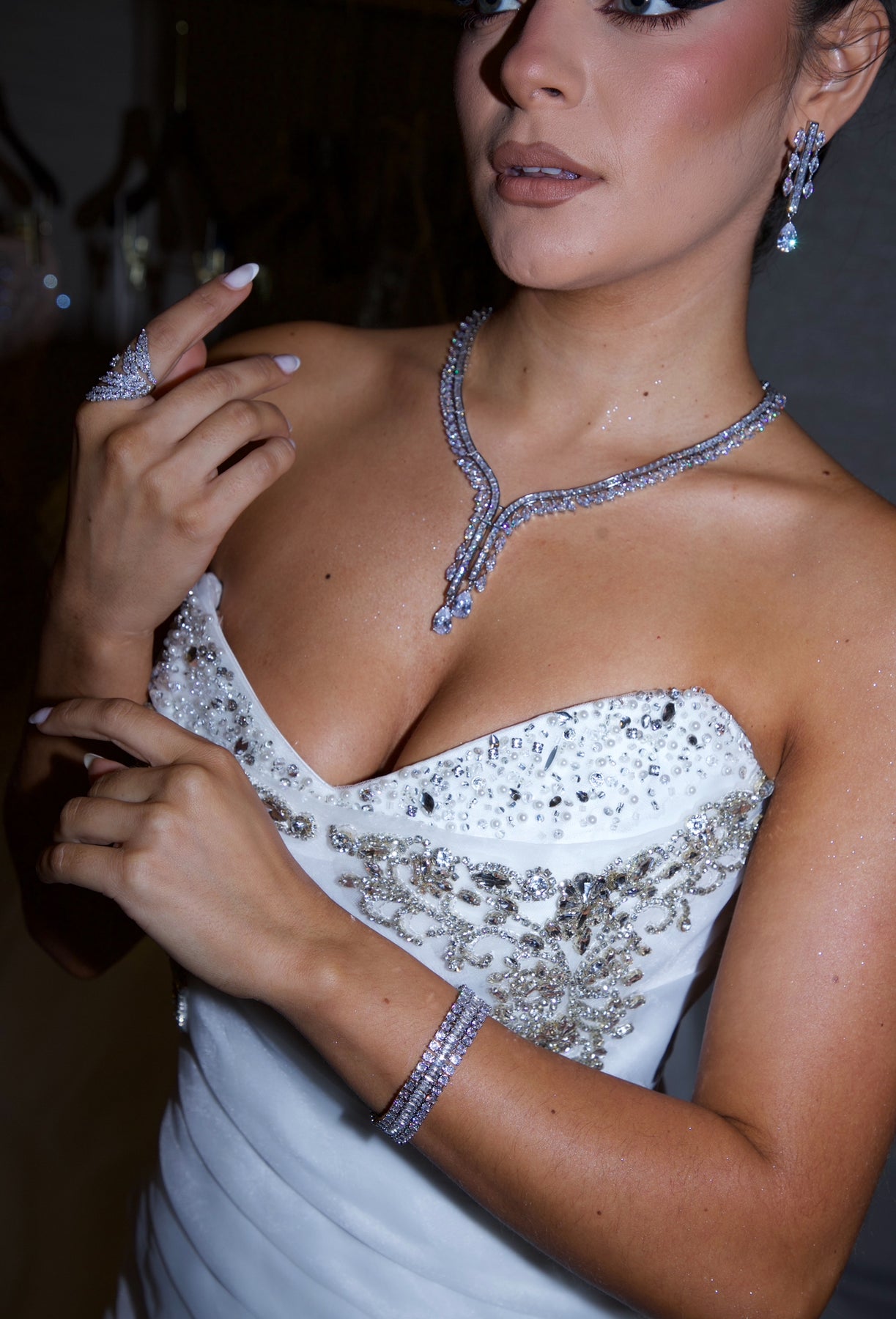 Marquise cut cubic zirconias, creating a sparkling leaflike design. Adjustable fit available in both white gold and yellow gold plated.